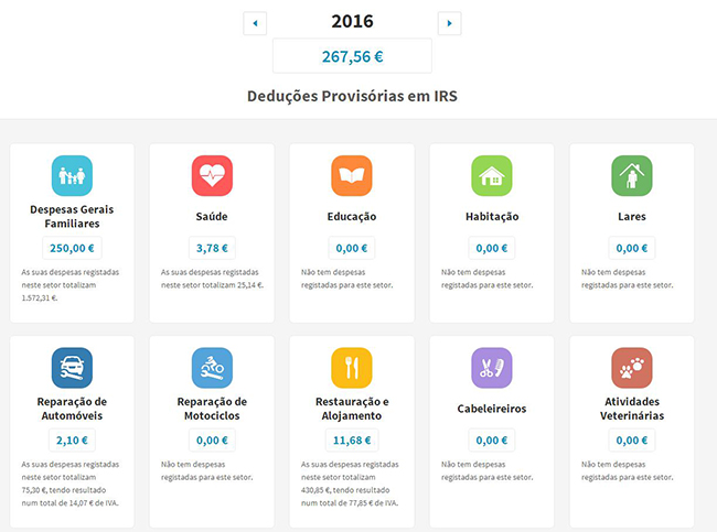 3º Passo - Para cada uma das faturas escolha atividade a que se refere selecionando o respetivo ícone, nomeadamente: despesas gerais familiares, saúde, educação, habitação, lares, reparação de automóveis, reparação de motociclos, restauração, alojamento ou cabeleireiros.